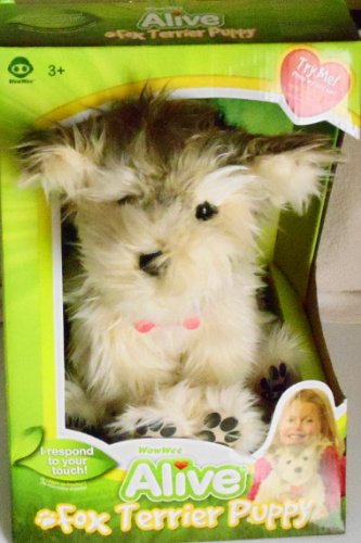 Fox Terrier Puppy is one of the lovable and huggable animals from Wow Wee Alive. Playing with the Fox Terrier Puppy is as close as you can get to having the real animal to nurture and take care of in your home. Listen to him react with bay animal sounds when you stroke his back, pat his head, or cradle him. The puppy has a moving mouth, blinking eyes and soft fur.